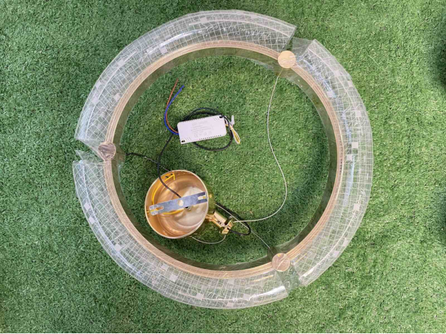 - Design: Circular ring chandelier encased in faceted crystal segments