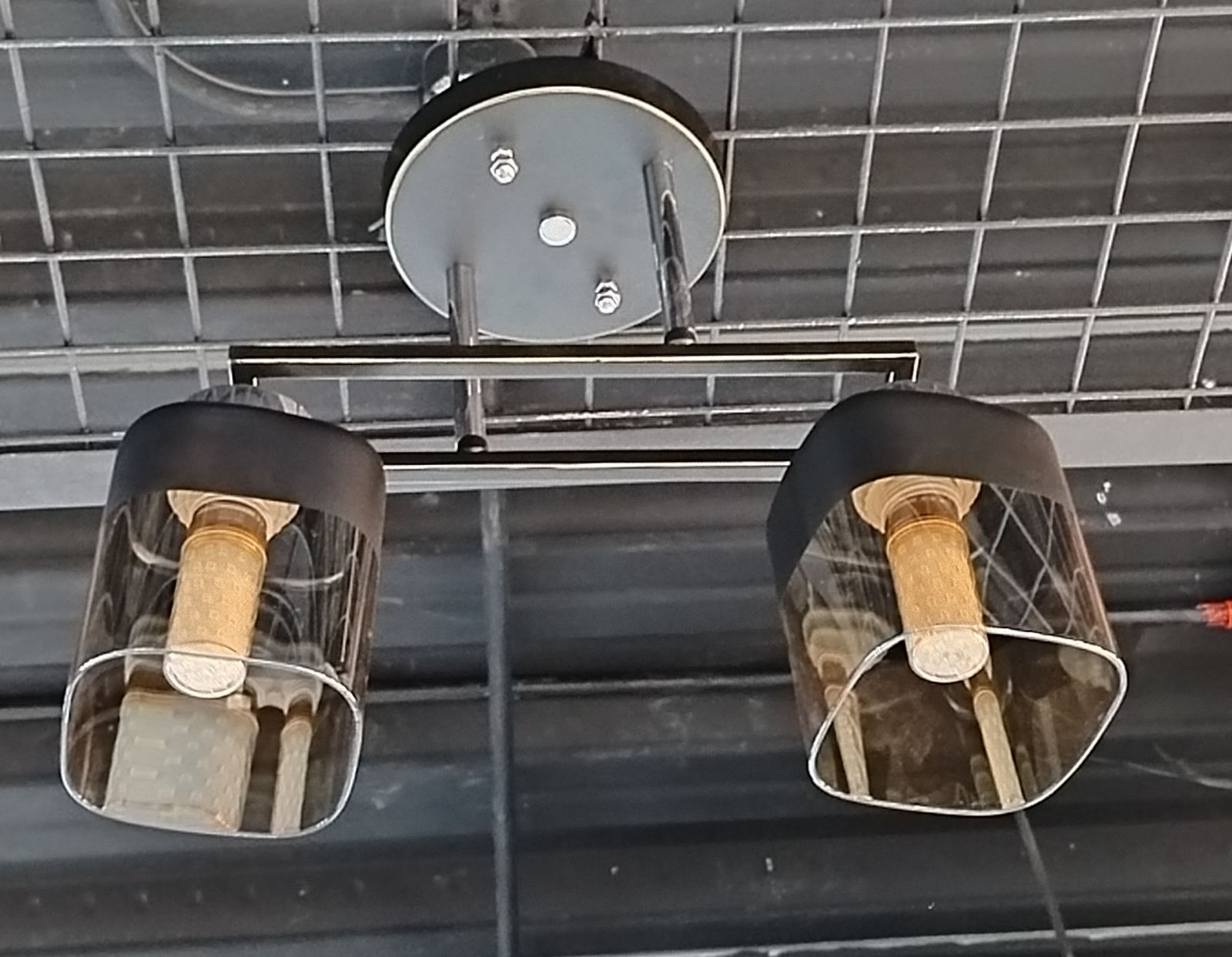 Design: Twin smoked-glass square cylinder shades with a matte black frame and brass fittings for a chic, modern aesthetic